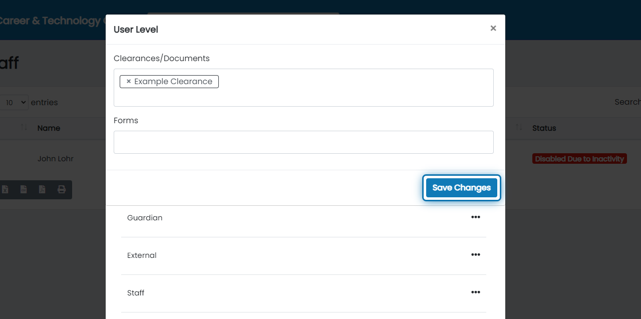 16. Once you're done assigning clearances, click the X to close the modal