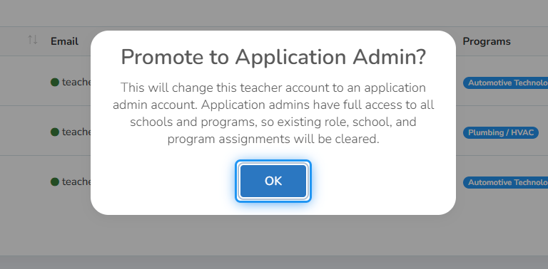 Application Admins have full access to all schools and programs by default, so existing role, school, and program assignments are cleared. Admin-specific roles can be configured from the Application Admins page after the promotion.